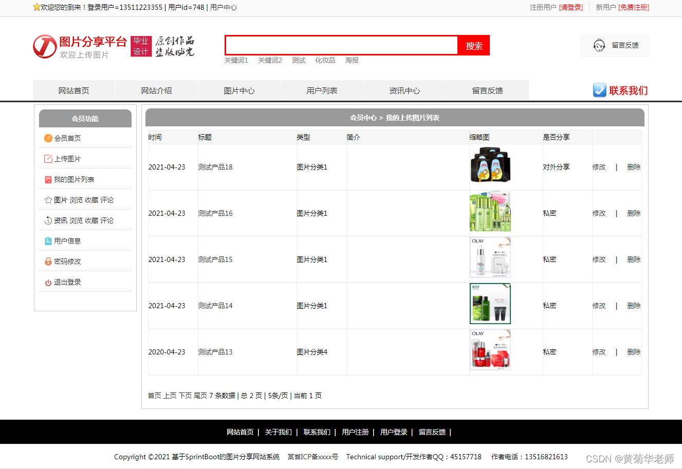 我的图片列表:显示我所有上传的图片信息,支持修改和删除。