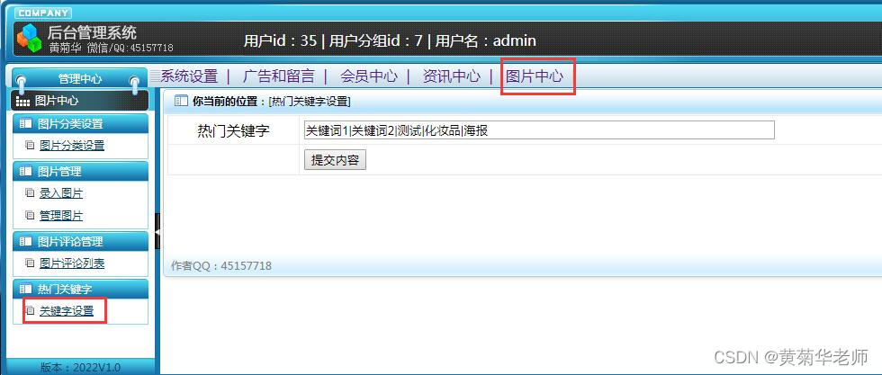 关键字设置:设置需要在前台查询框下面显示的热门图片名称,按|分隔