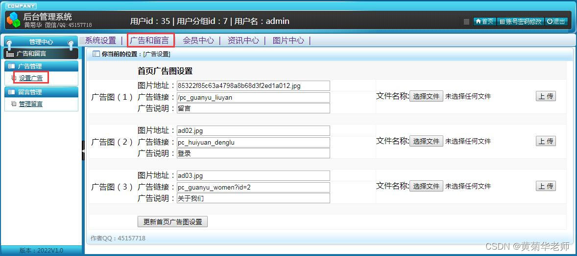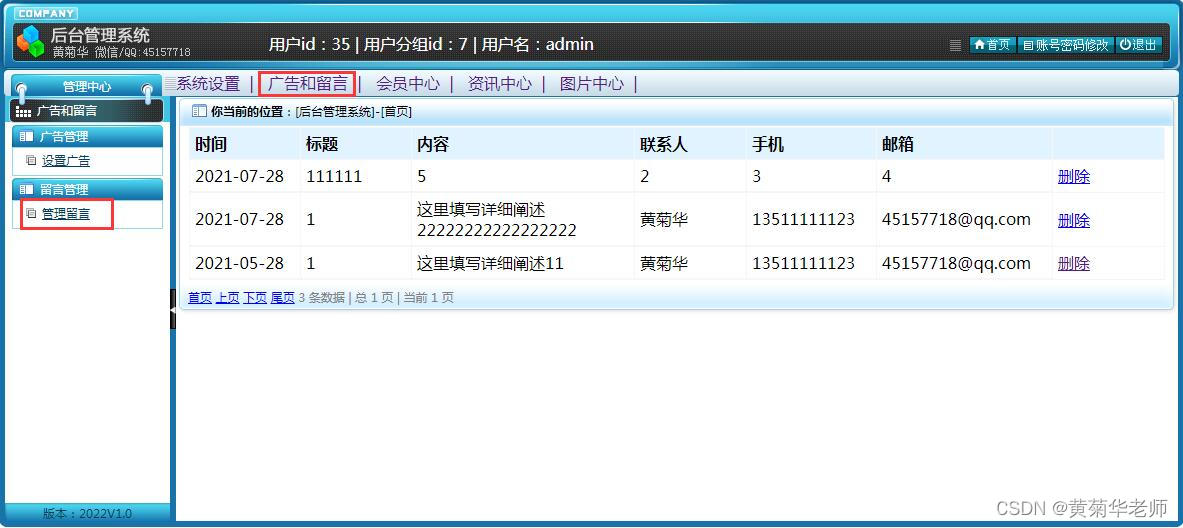 留言反馈:用户填写李哭咽的主题、联系人、电话、邮箱、留言内容;后台管理可以查看留言列表,可以删除留言。。