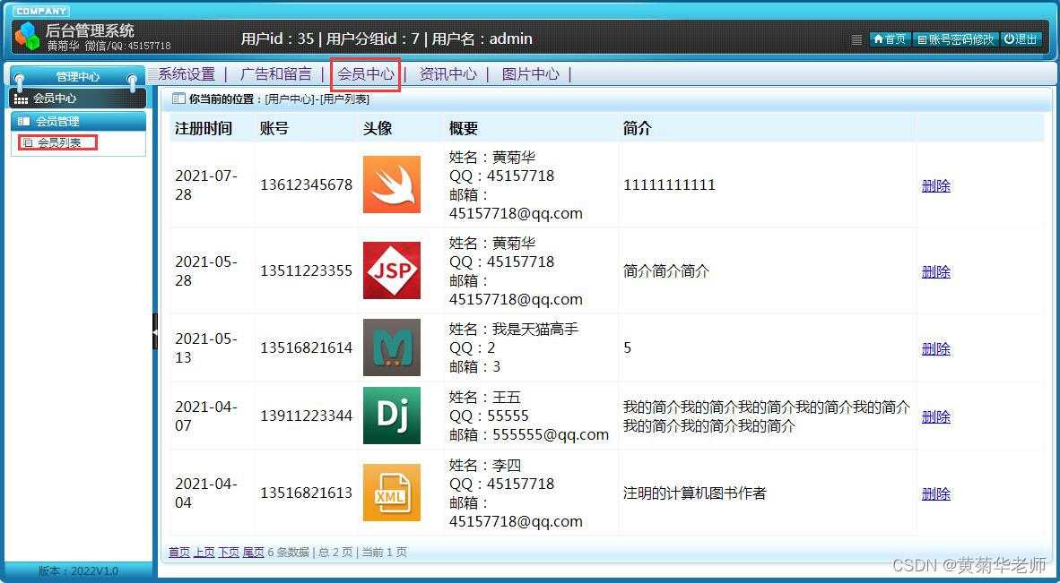 用户信息:姓名、联系方式、邮箱、头像、简介、介绍等,支持随时修改;用户注册的信息后台管理员可见;后台管理员可以删除
