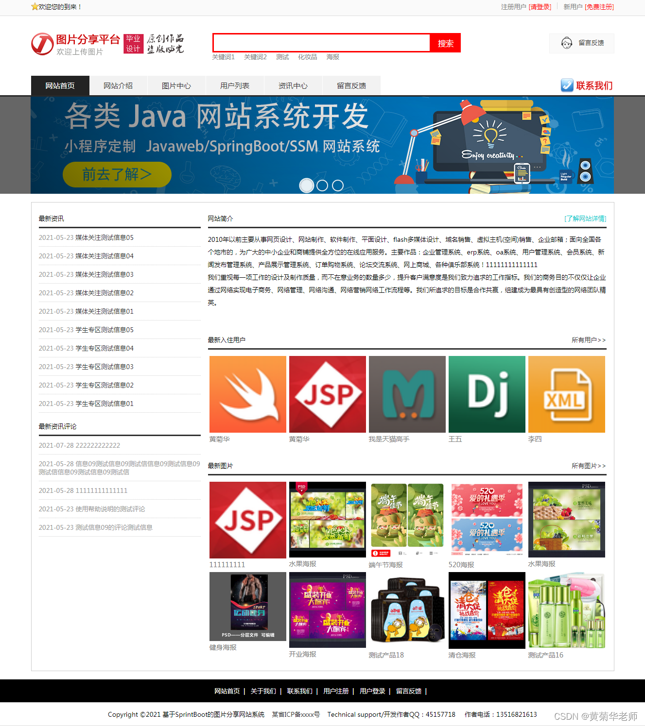 目的:本课题主要目标是设计并能够实现一个基于web网页的图片照片分享网站系统,整个网站项目使用了B/S架构,基于java的springboot框架下开发;管理员通过后台录入信息、管理信息,设置网站信息,管理会员信息,管理和设置广告、留言、管理用户上传的图片照片;用户通过登录网站,查询查看新闻资讯、发表评论、分享上传自己的图片照片,同时可以点评别人发布的图片照片信息。