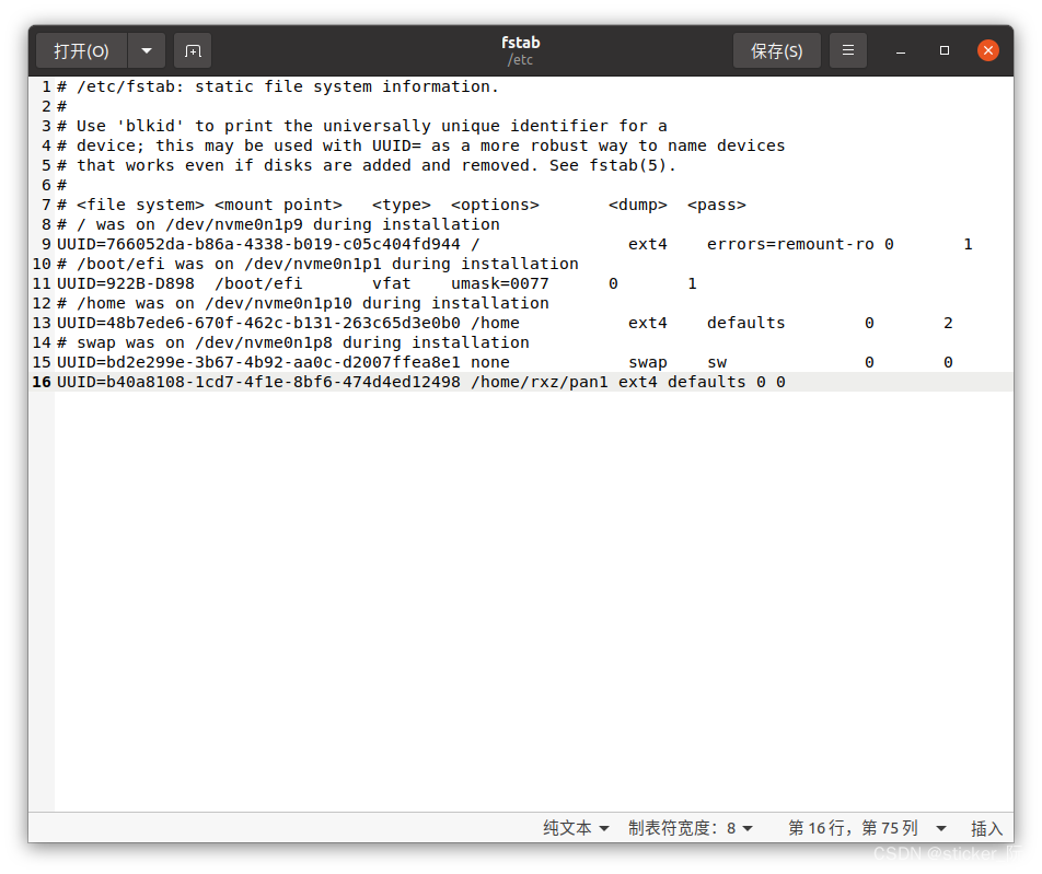 其中,UUID大家都不一样,填自己查到的,然后后面的/home/rxz/pan1是挂载点名称和地址,再后面的ext4是磁盘格式,倒数第二个数字0表示不备份,最后一个数字必须为2或0(除非引导分区为1)。