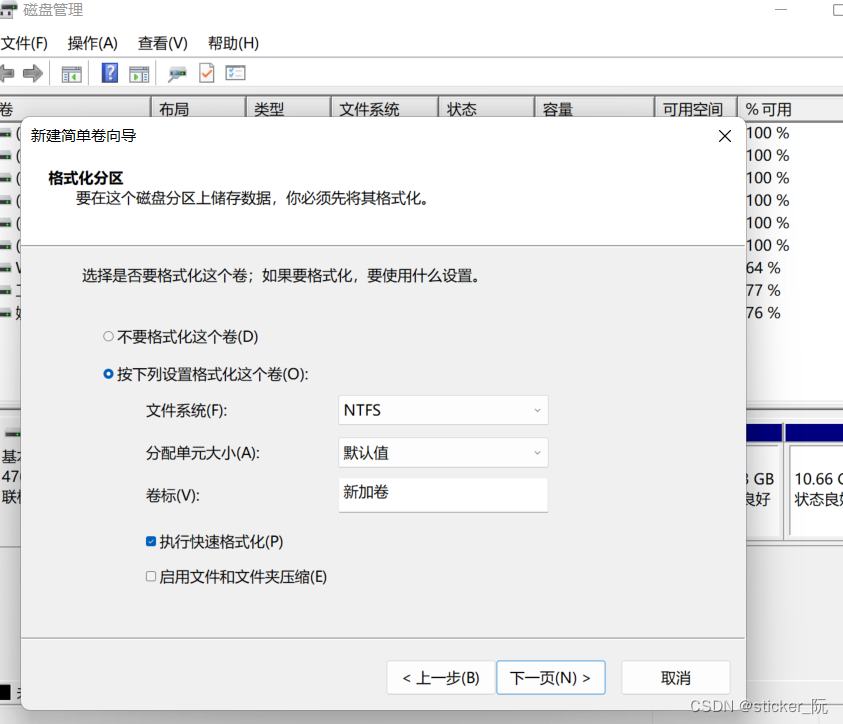 随后,右击刚压缩出来的空白卷,进行新建简单卷。系统文件类型选择NTFS格式。