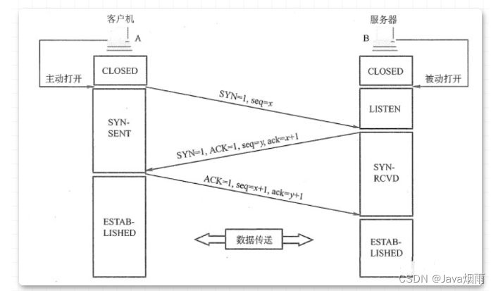 第三次握手:客户端收到确认后检查,如果正确则将标志位ACK为1,ack=y+1,并将该数据包发送给服务端,服务端进行检查如果正确则连接建立成功,客户端和服务端进入established状态,完成三次握手,随后客户端和服务端之间可以开始传输 数据了