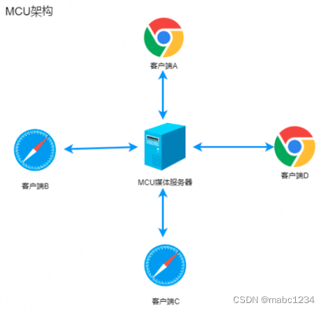 该方案由一个服务器和多个终端组成一个星形结构。各终端将自己要共享的音视频流发送给服务器,服务器端会将在同一个房间中的所有终端的音视频流进行混合,最终生成一个混合后的音视频流再发给各个终端,这样各终端就可以看到 / 听到其他终端的音视频了。实际上服务器端就是一个音视频混合器,这种方案服务器的压力会非常大。