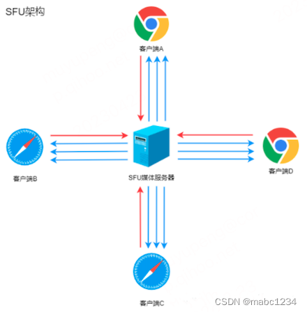 该方案也是由一个服务器和多个终端组成,但与 MCU 不同的是,SFU 不对音视频进行混流,收到某个终端共享的音视频流后,就直接将该音视频流转发给房间内的其他终端。它实际上就是一个音视频路由转发器。