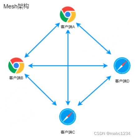 即多个终端之间两两进行连接,形成一个网状结构。比如 A、B、C 三个终端进行多对多通信,当 A 想要共享媒体(比如音频、视频)时,它需要分别向 B 和 C 发送数据。同样的道理,B 想要共享媒体,就需要分别向 A、C 发送数据,依次类推。这种方案对各终端的带宽要求比较高。