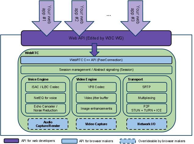 webrtc主要包含,Web API、webRTC C++ API、session管理、音频引擎、视频引擎、网络传输模块。