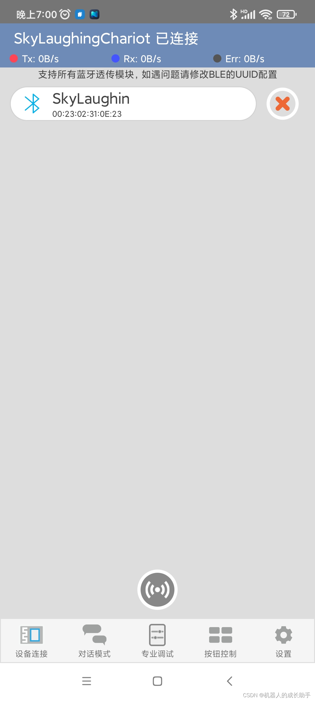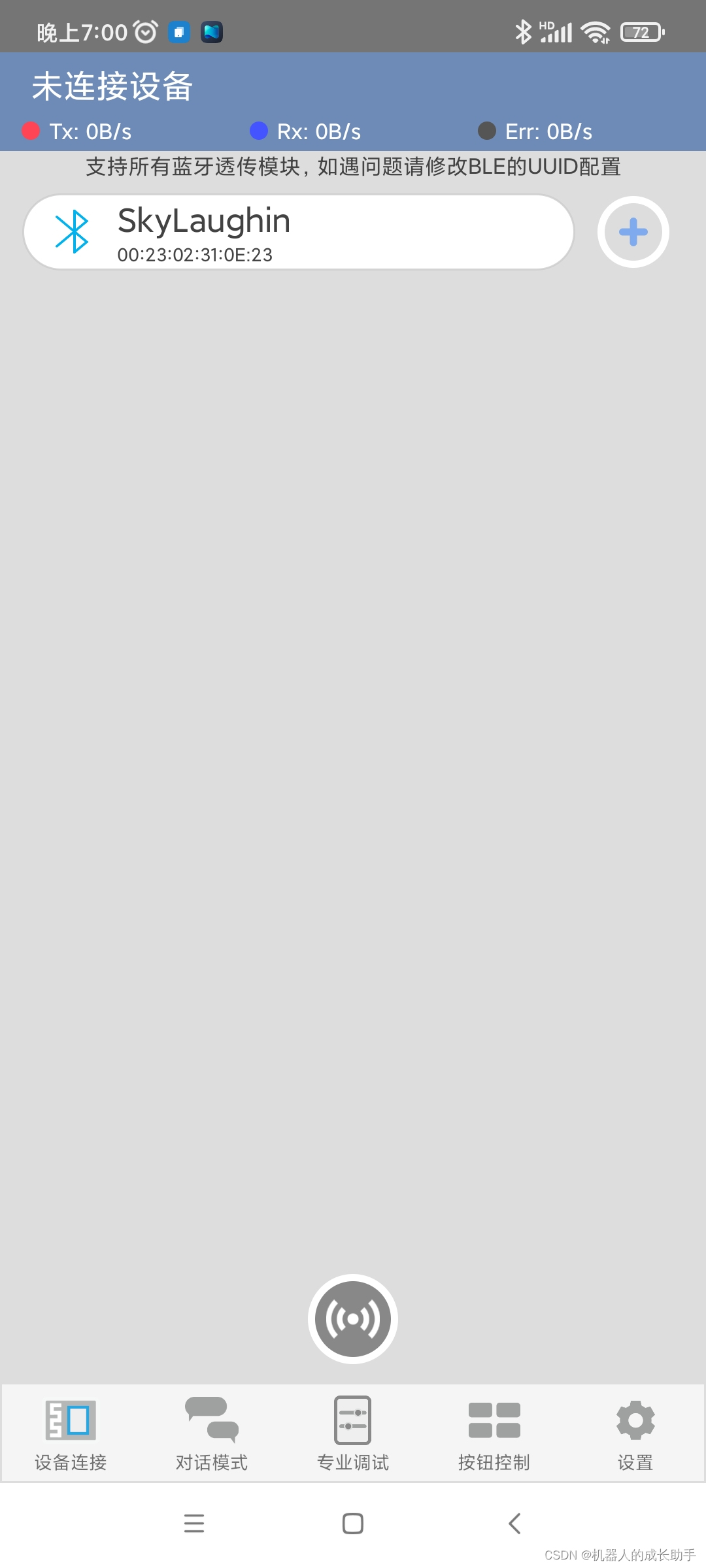 1、打开蓝牙调试器软件,点击底部中间的扫描按钮,显示可配对的设备。软件可直接百度搜索下载,但苹果手机无法下载。