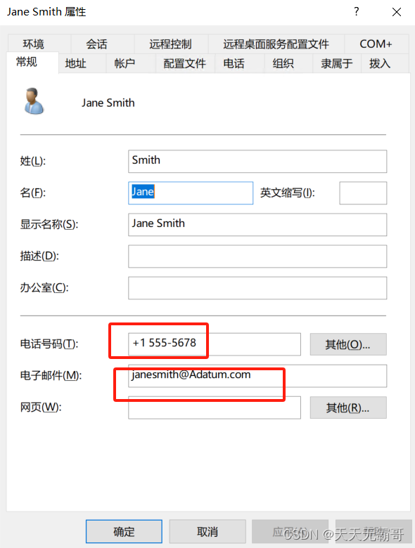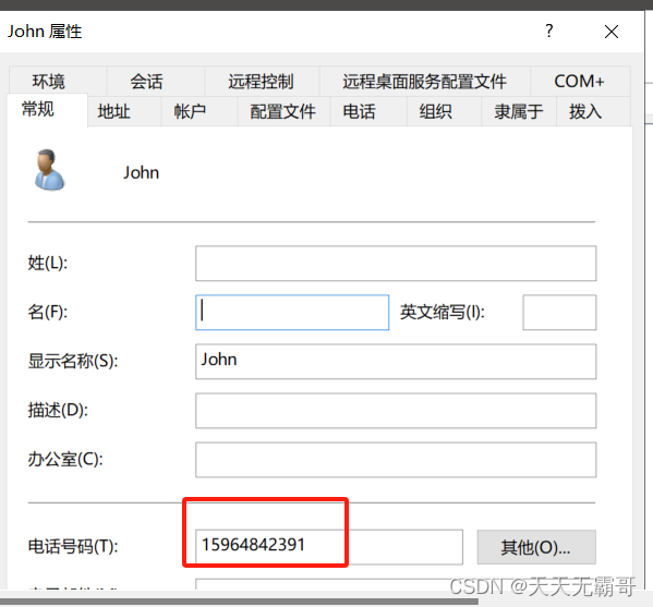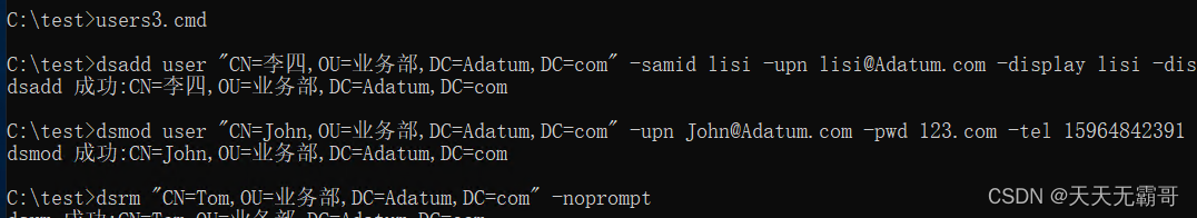 Dsmod user "CN=John,OU=业务部,DC=Adatum,DC=com" -upn John@Adatum.com -pwd 123.com -tel 15964842391
