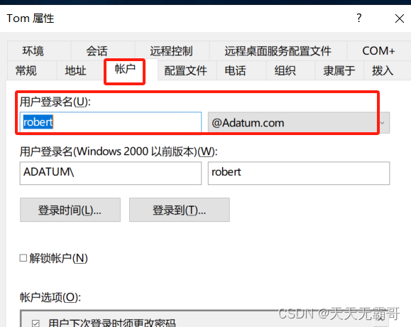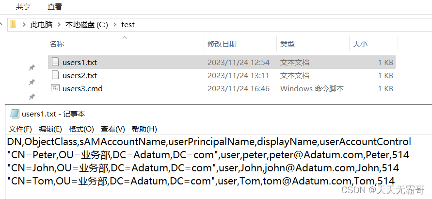 "CN=Tom,OU=业务部,DC=Adatum,DC=com",user,Tom,tom@Adatum.com,Tom,514