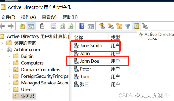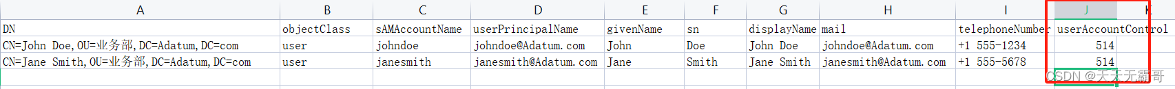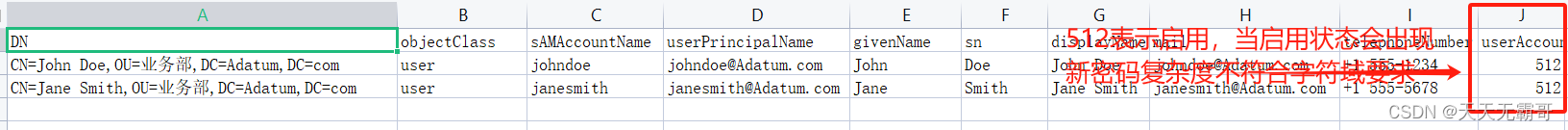 "CN=John,OU=业务部,DC=Adatum,DC=com",user,John,john@Adatum.com,John,514