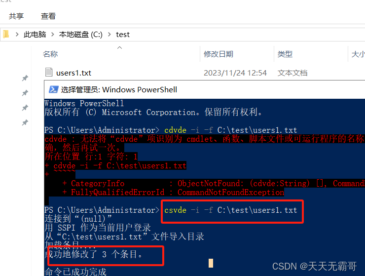 用管理员的身份打开Power Shell,运行csvde -I -f C:\test\users1.txt