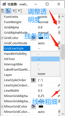 从图中可见,GridColor可以调整颜色,GridAlpha可以调整网格线颜色深浅(也可以说是透明度,最大为1.0),LineWidth可以调整线宽等等。