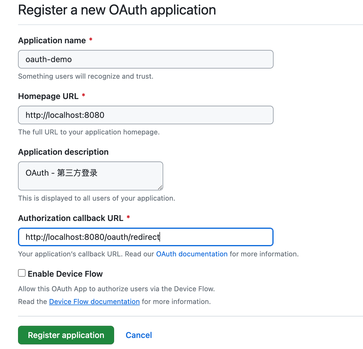 首先需要在github中对应用进行登记,让Github知道谁在发送请求。