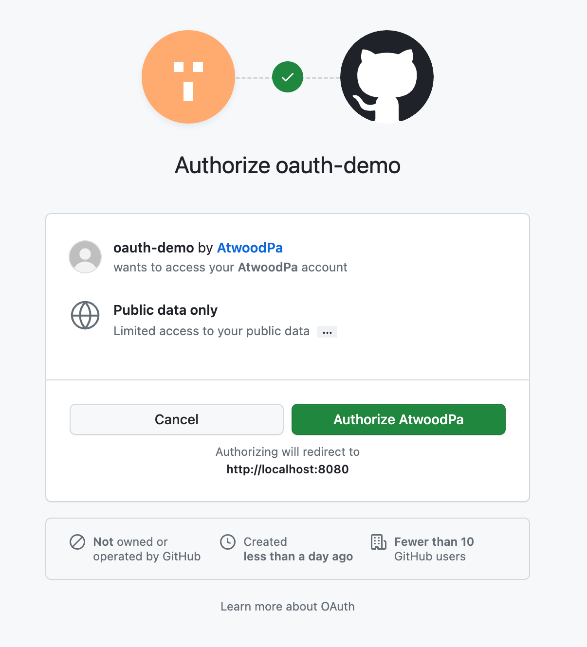 点击跳转到GitHub授权之后,GitHub会询问示例代码正在请求数据,您是否同意授权。