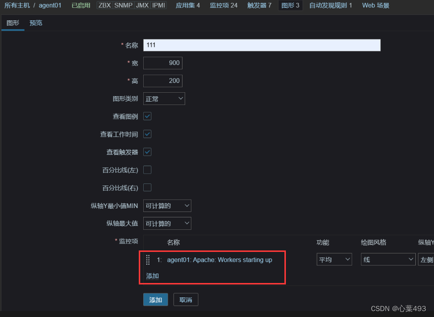 在主机里找到图形-创建图形-添加监控项-确定添加