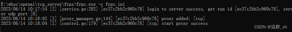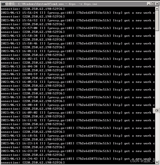 第三步启动frps,打开cmd,cd/d到frps所在文件夹,输入frps -c 配置ini文件名即可,若frpc连接成功会出现以下提示(启动时也会有提示,是否成功,不过已经被cmd刷新了截图不到...)