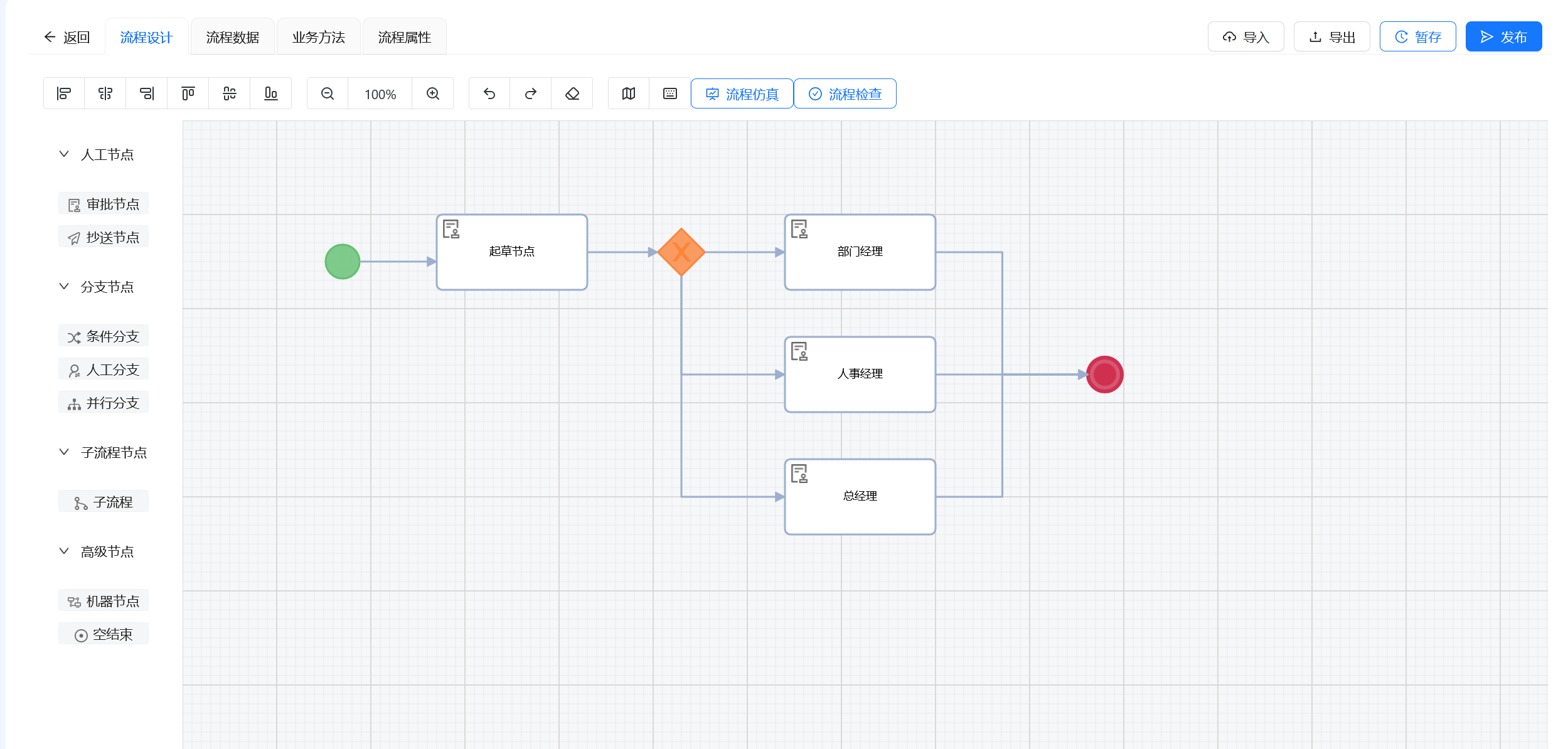 流程设计器主要用于流程编排,并提供包括流程干预、流程监控、任务统计等辅助功能。