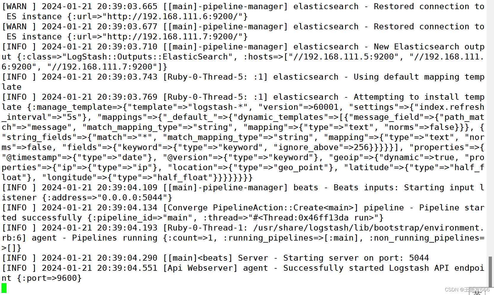 [INFO ] 2024-01-20 20:24:34.474 [Api Webserver] agent - Successfully started Logstash API endpoint {:port=>9600}