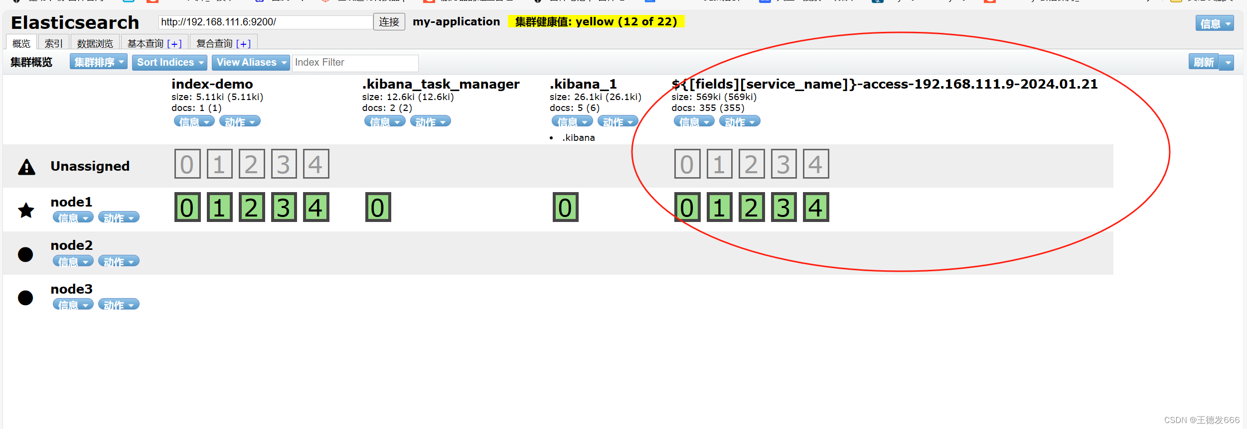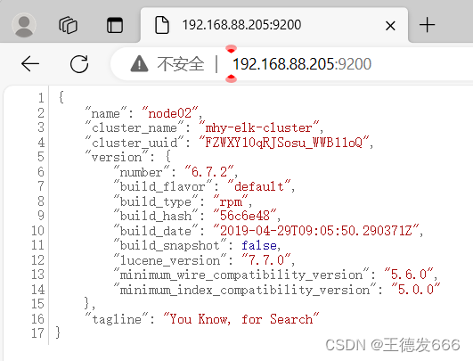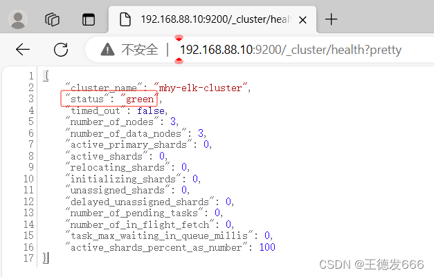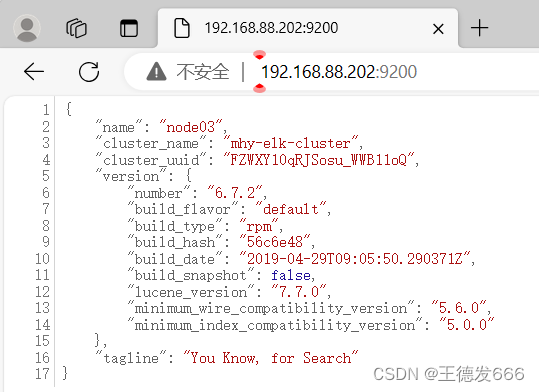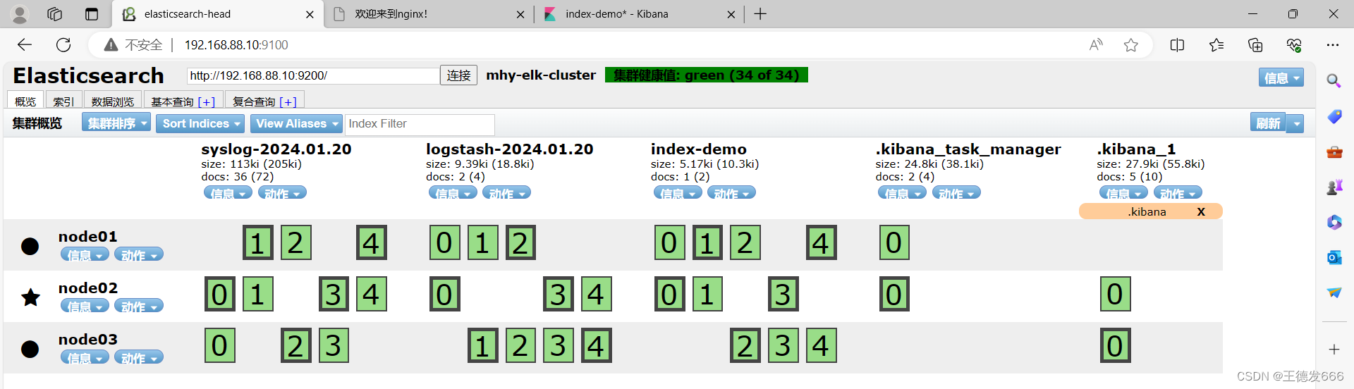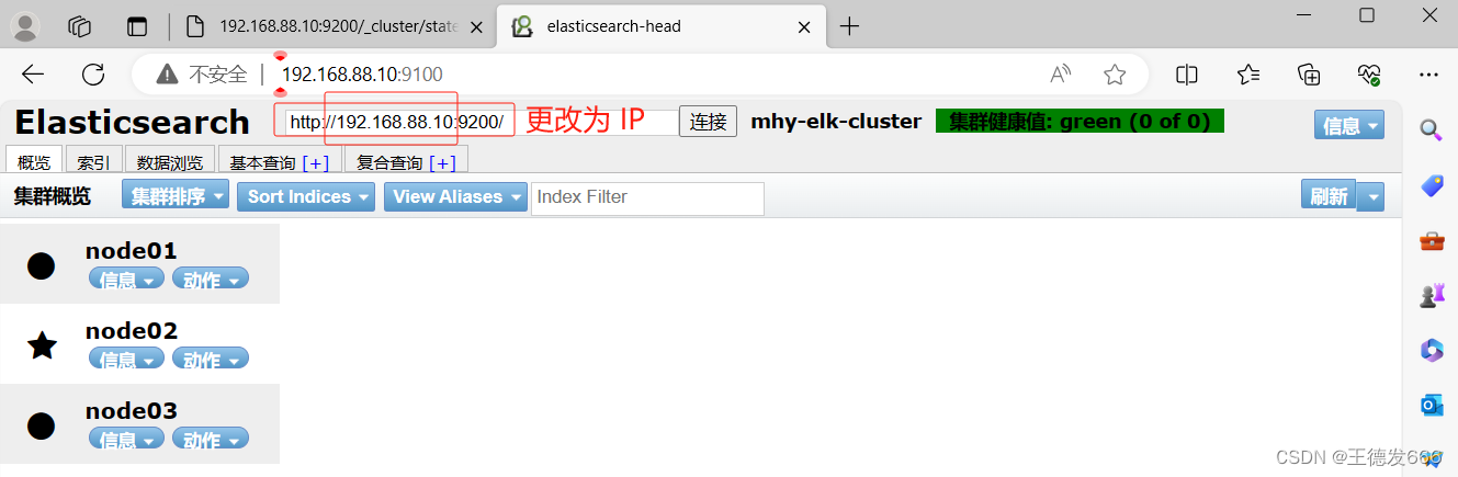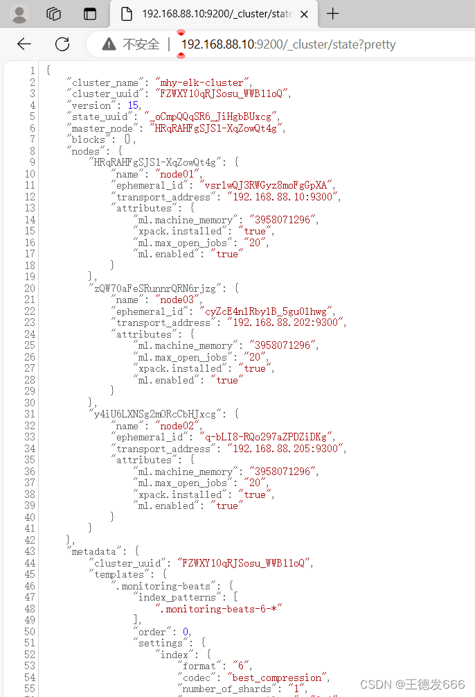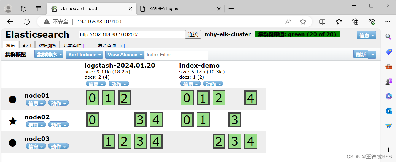 浏览器访问 http://IP:9200查看节点 node01、node02、node03 的信息 浏览器访问 http://IP:9200/_cluster/health?pretty 查看群集的健康情况,可以看到 status 值为 green(绿色), 表示节点健康运行 浏览器访问 http://IP:9200/_cluster/state?pretty 检查群集状态信息