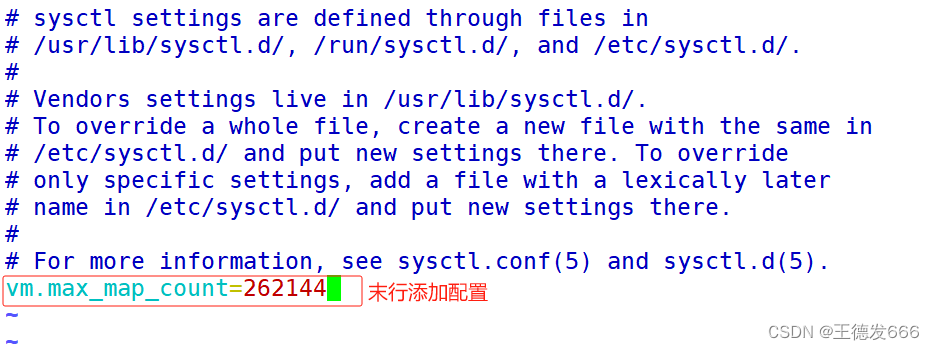 #进入配置文件,添加配置 [root@node01 opt]# vim /etc/sysctl.conf vm.max_map_count=262144