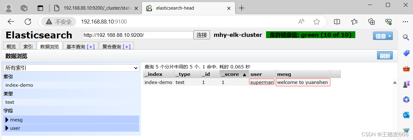 [root@node01 elasticsearch-head-master]# curl -X PUT 'localhost:9200/index-demo/test/1?pretty&pretty' -H 'content-Type: application/json' -d '{"user":"superman","mesg":"welcome to yuanshen"}'