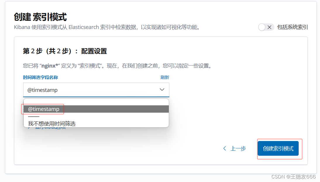 浏览器访问 http://192.168.80.10:5601 登录 Kibana,单击“Create Index Pattern”按钮添加索引“filebeat-*”,单击 “create” 按钮创建,单击 “Discover” 按钮可查看图表信息及日志信息。