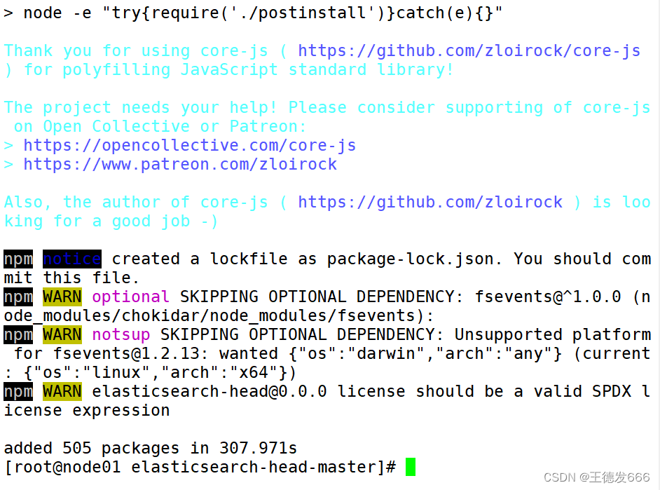 #cd到 opt目录下传输 elasticsearch-head-master.zip [root@node01 bin]# cd /opt/ [root@node01 opt]# rz -E rz waiting to receive. [root@node01 opt]# ls elasticsearch-6.7.2.rpm elasticsearch-head-master.zip node-v8.2.1 node-v8.2.1.tar.gz phantomjs-2.1.1-linux-x86_64 phantomjs-2.1.1-linux-x86_64.tar.bz2 rh #解压压缩包 [root@node01 opt]# unzip elasticsearch-head-master.zip #cd到指定目录下,进行安装 [root@node01 opt]# cd elasticsearch-head-master/ [root@node01 elasticsearch-head-master]# npm install