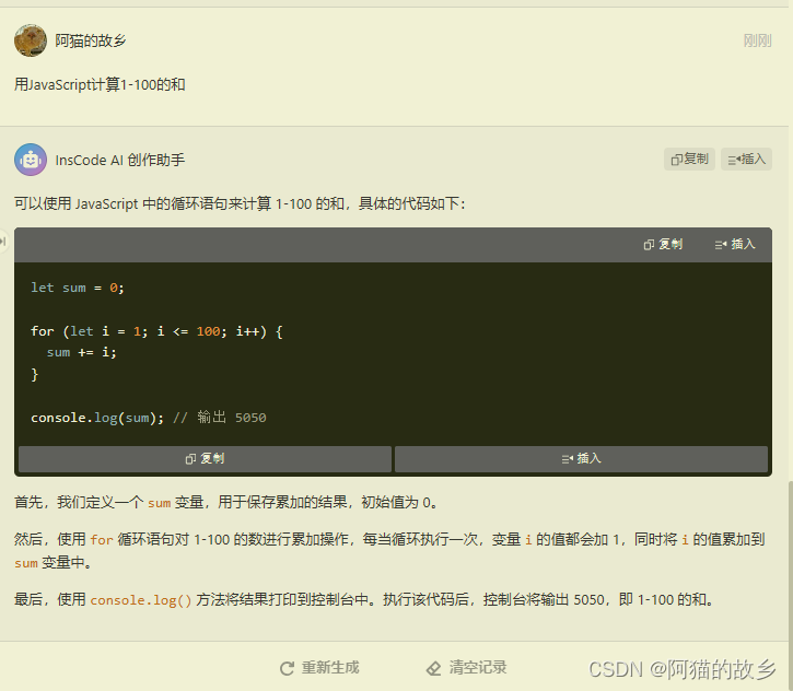 结果显而易见,是一段没有问题的代码。综上所述,InsCode AI 创作助手是一个非常方便的工具,操作简单,没有其他冗余的操作。