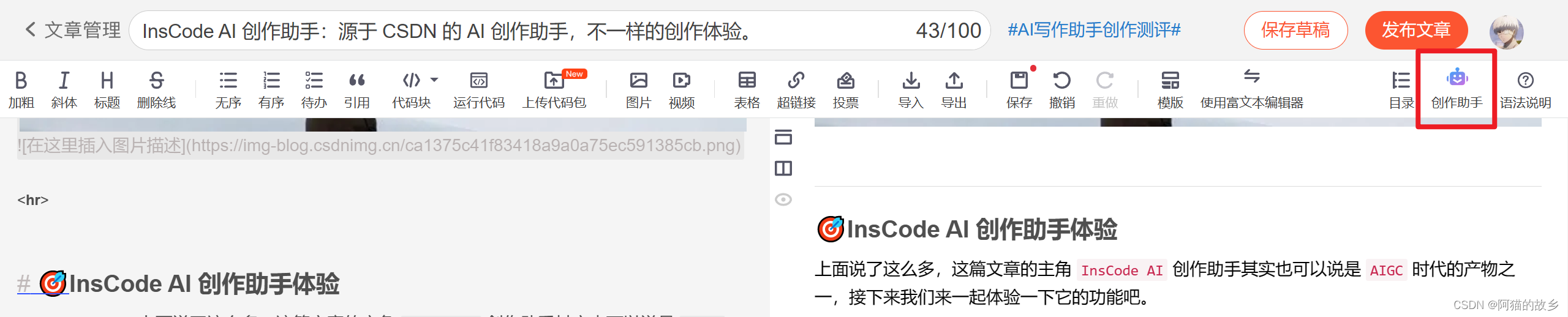 这里我用的是 markdown 编译器写的文章,因此 InsCode AI 在工具栏的右上角,logo 是一个蓝紫渐变色的机器人(快捷键 Ctrl + L),我们在写博客的时候可以很轻松的发现到它。