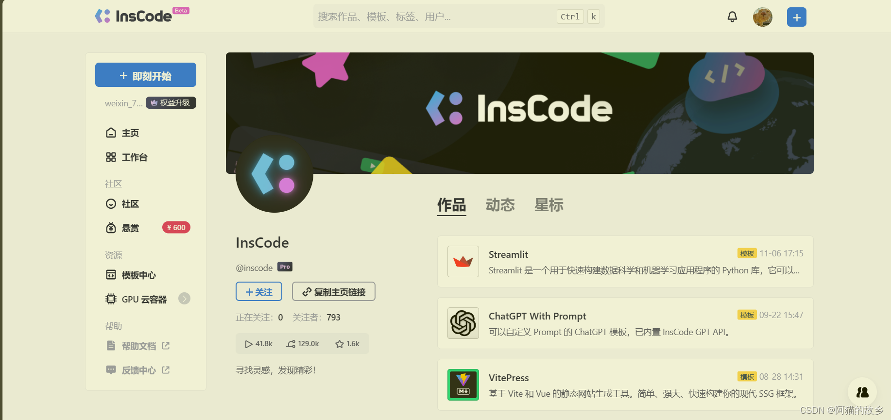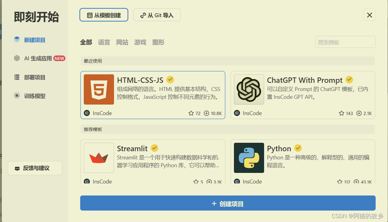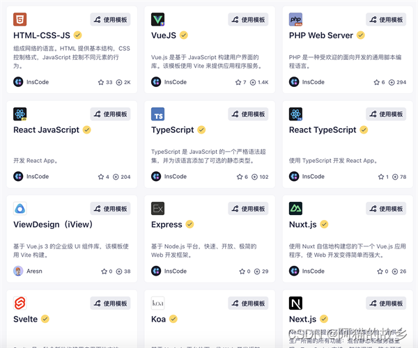 除编程语言外,模板中心还有丰富的模板可供用户选择,像热门的 VueJS、React、Next.js、Nuxt.js 都是有的,当然,也少不了 iView (这里有一个小秘密:InsCode 网站就是用 iView 开发的)