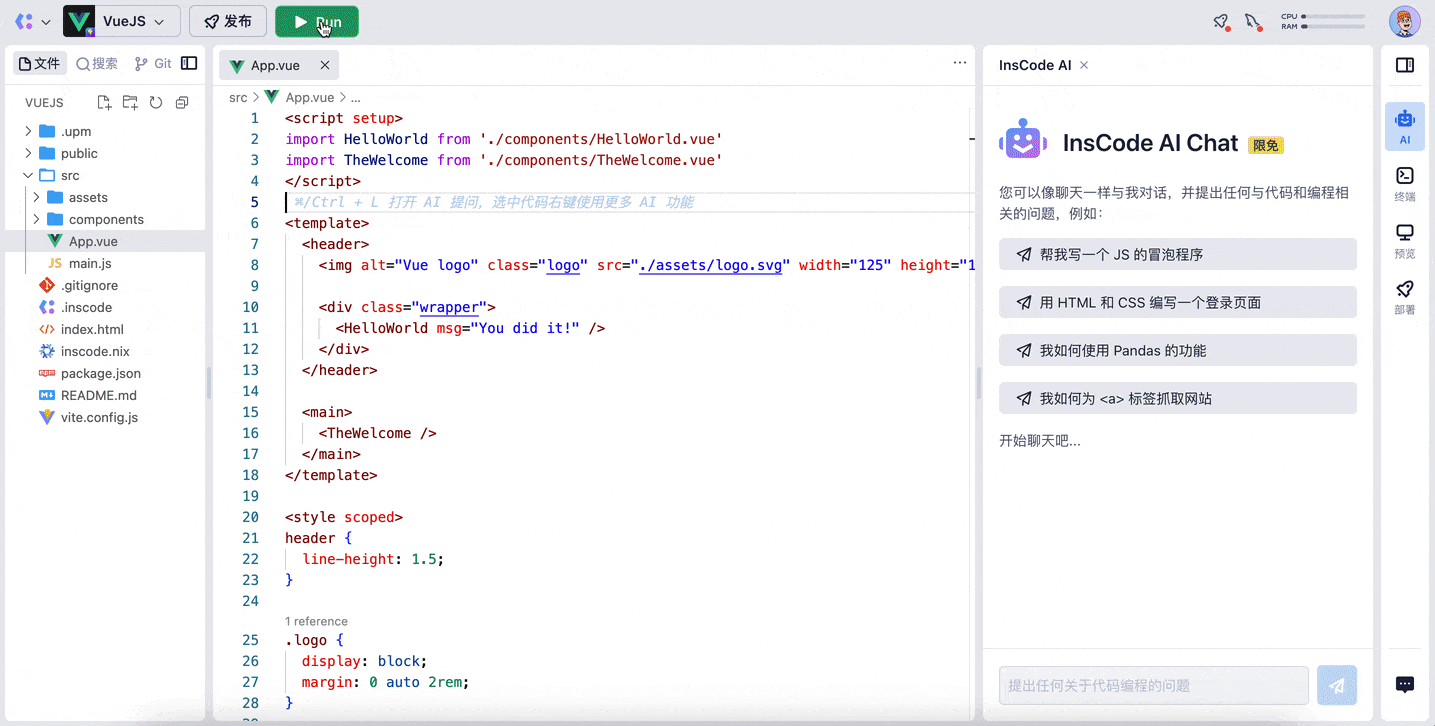 比如说当前的Al比较火的 chatGPT 关于 InsCode 就内置了 AI
