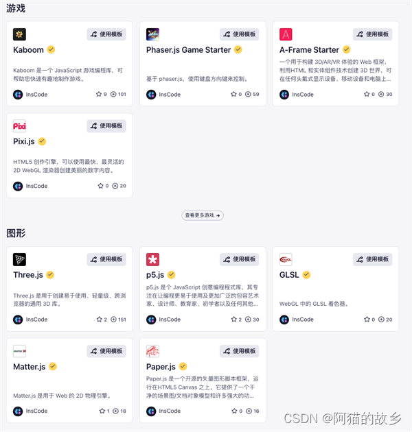 除此之外,InsCode模板中心还有不少游戏和图形相关的框架,如 Three.js、p5.js 以及 WebGL 等。在这里向大家推荐Kaboom ,InsCode上一个好玩的小游戏,有兴趣的用户可以进行尝试。