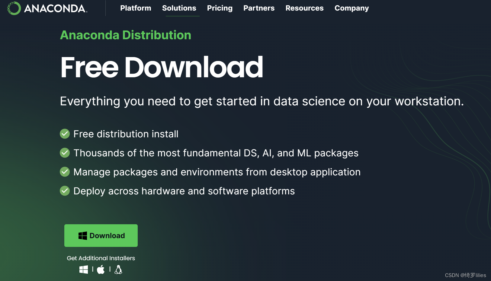 首先,访问Anaconda官方网站(https://www.anaconda.comFree Download | Anacondahttps://www.anaconda.com)下载适合您操作系统的Anaconda安装包。选择最新版本的Anaconda,根据您的操作系统选择对应的下载链接,比如Windows、macOS或Linux。