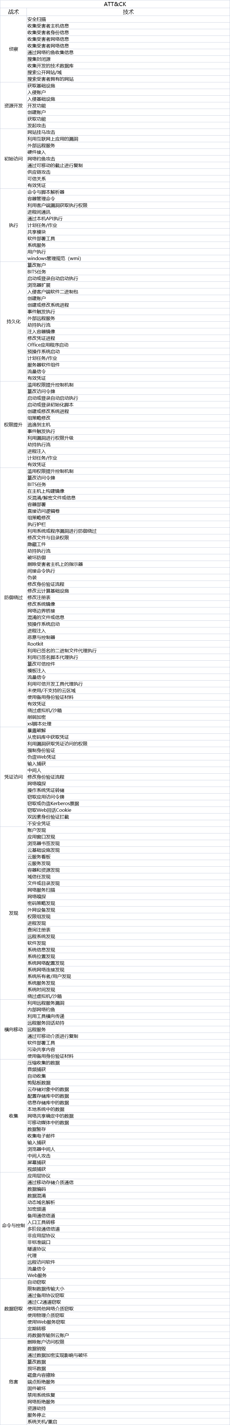 - Enterprise:攻击时的部分已知技术手段,例如访问初始化、执行、常驻、提权、防御规避、访问凭证、发现、横向移动、收集、数据获取、命令和控制等。