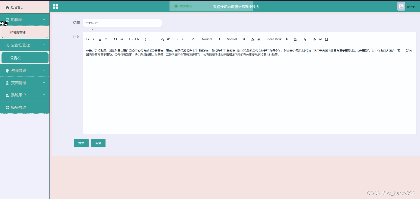(1)用户可以浏览公告的模块、公告的内容 (2)用户点击公告可以对公告进行详情阅读 |