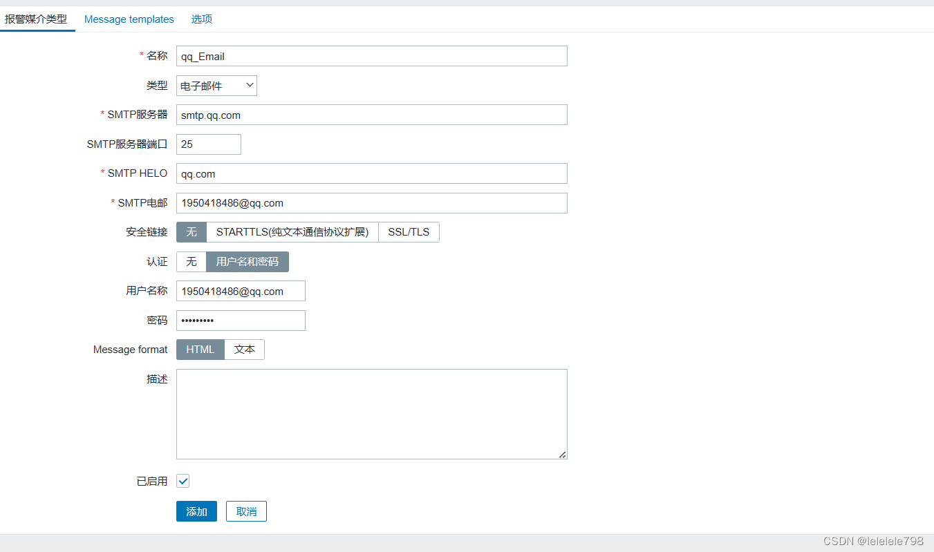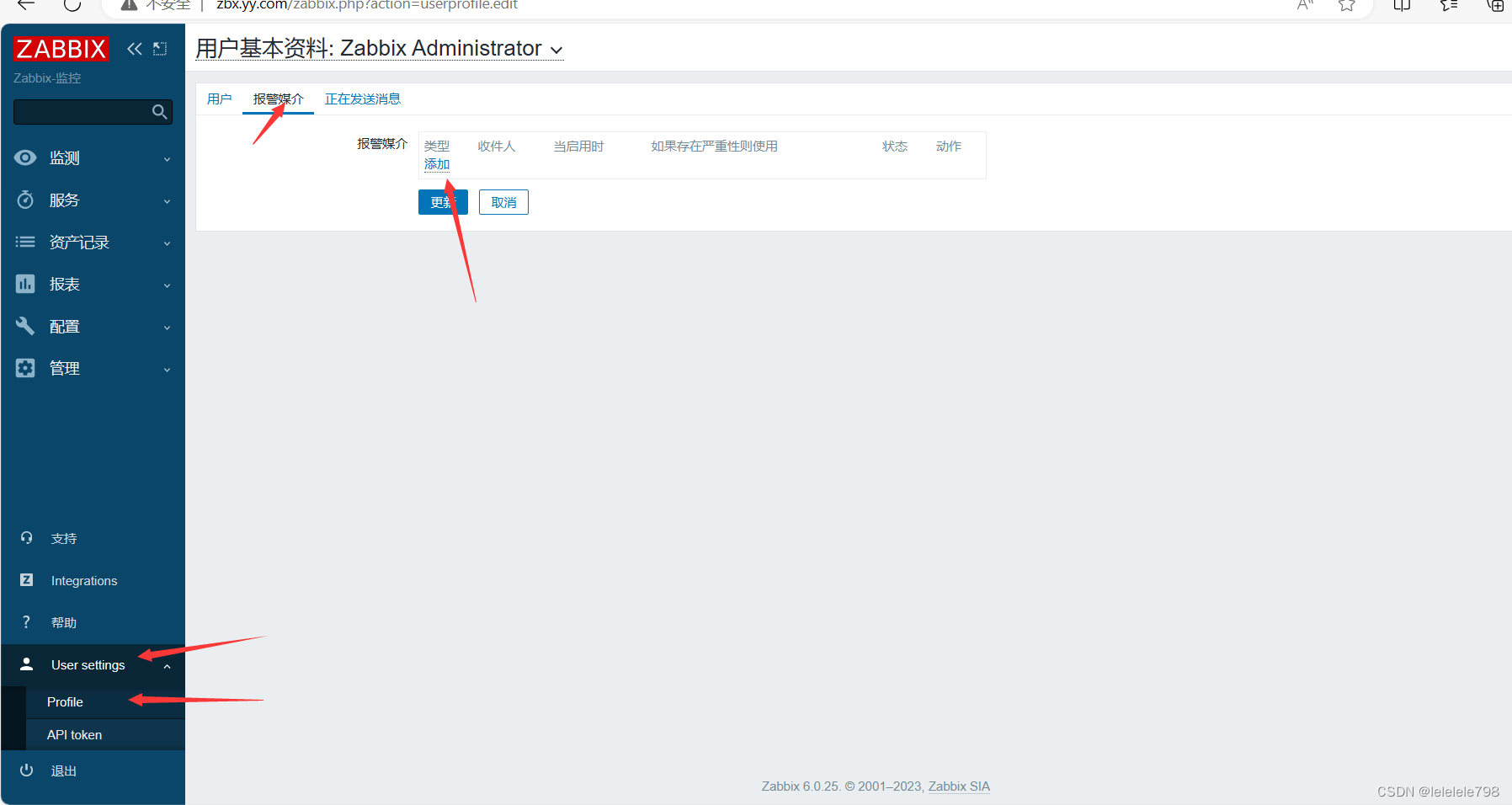 点击左边菜单栏【User settings】-->【Profile】-->【报警媒介】,点击【添加】