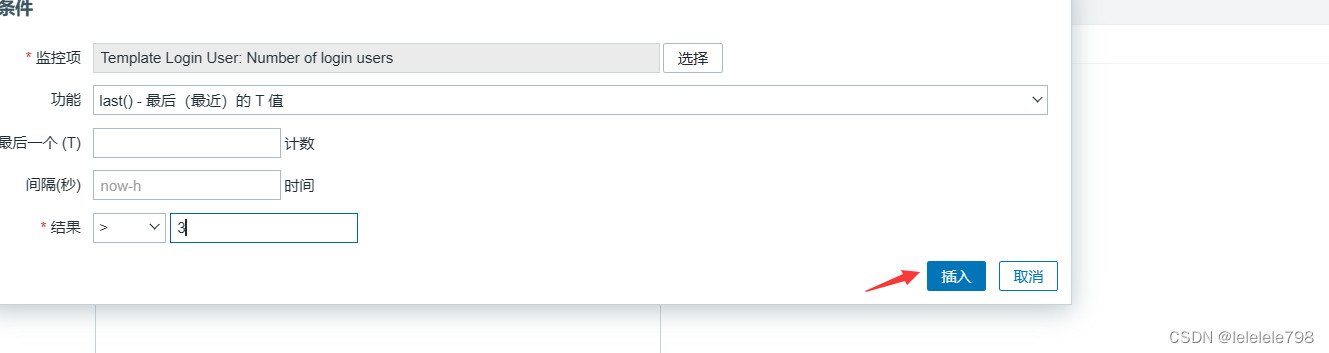 【表达式】点击添加,【监控项】点击选择 Number of login users,【功能】选择 last(),【结果】选择 > 3,点击 【插入】