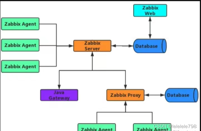zabbix proxy:zabbix代理端进程,部署在zabbix server与zabbix agent之间,代替zabbix server接收zabbix agent发送的监控数据并存储在本地,汇总后再转发给 zabbix server,从而可以分担zabbix server的集中式负载压力。