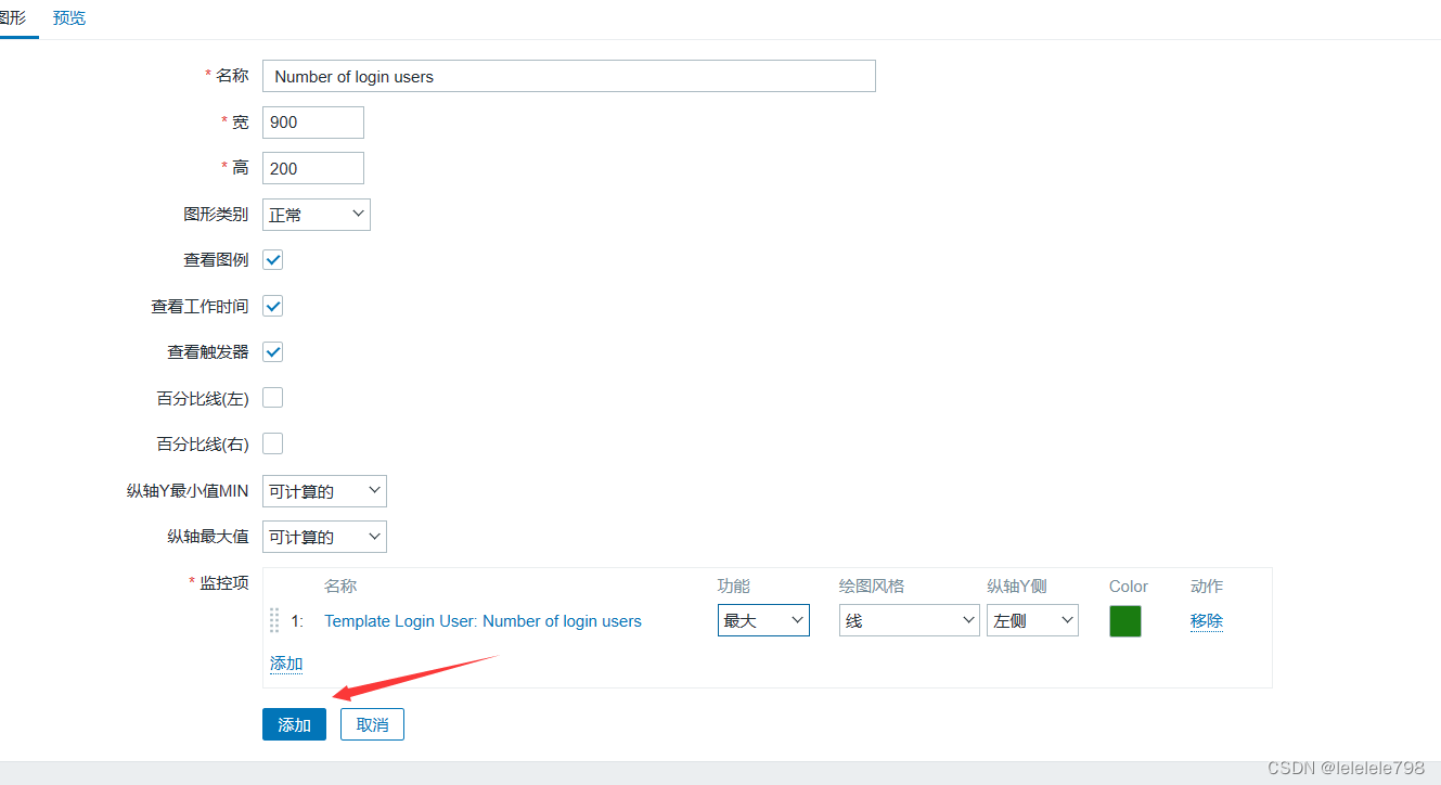 【监控项】点击添加勾选相关监控项 Number of login users,【功能】选择 最大,其它可保持默认值