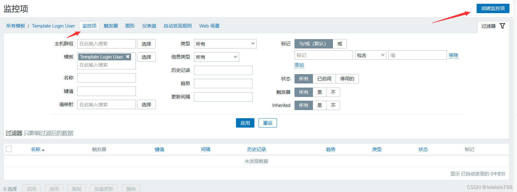 点击上方菜单栏【监控项】,点击【创建监控项】
