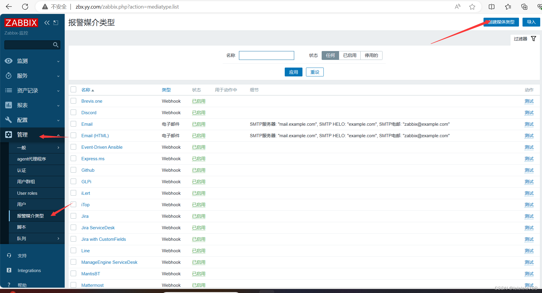点击左边菜单栏【管理】中的【报警媒介类型】,点击【创建媒体类型】