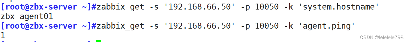 zabbix_get -s '192.168.66.50' -p 10050 -k 'agent.ping'