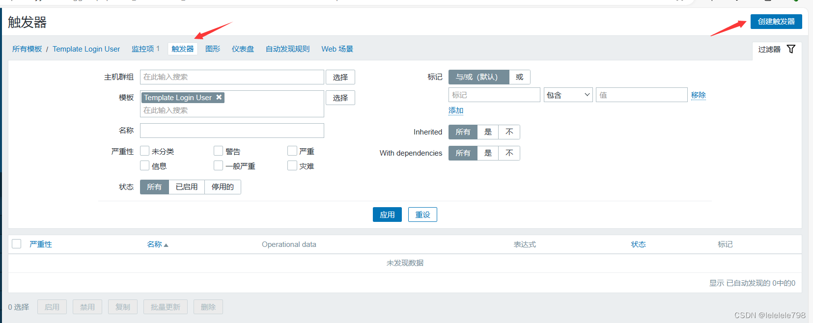 点击上方菜单栏【触发器】,点击【创建触发器】