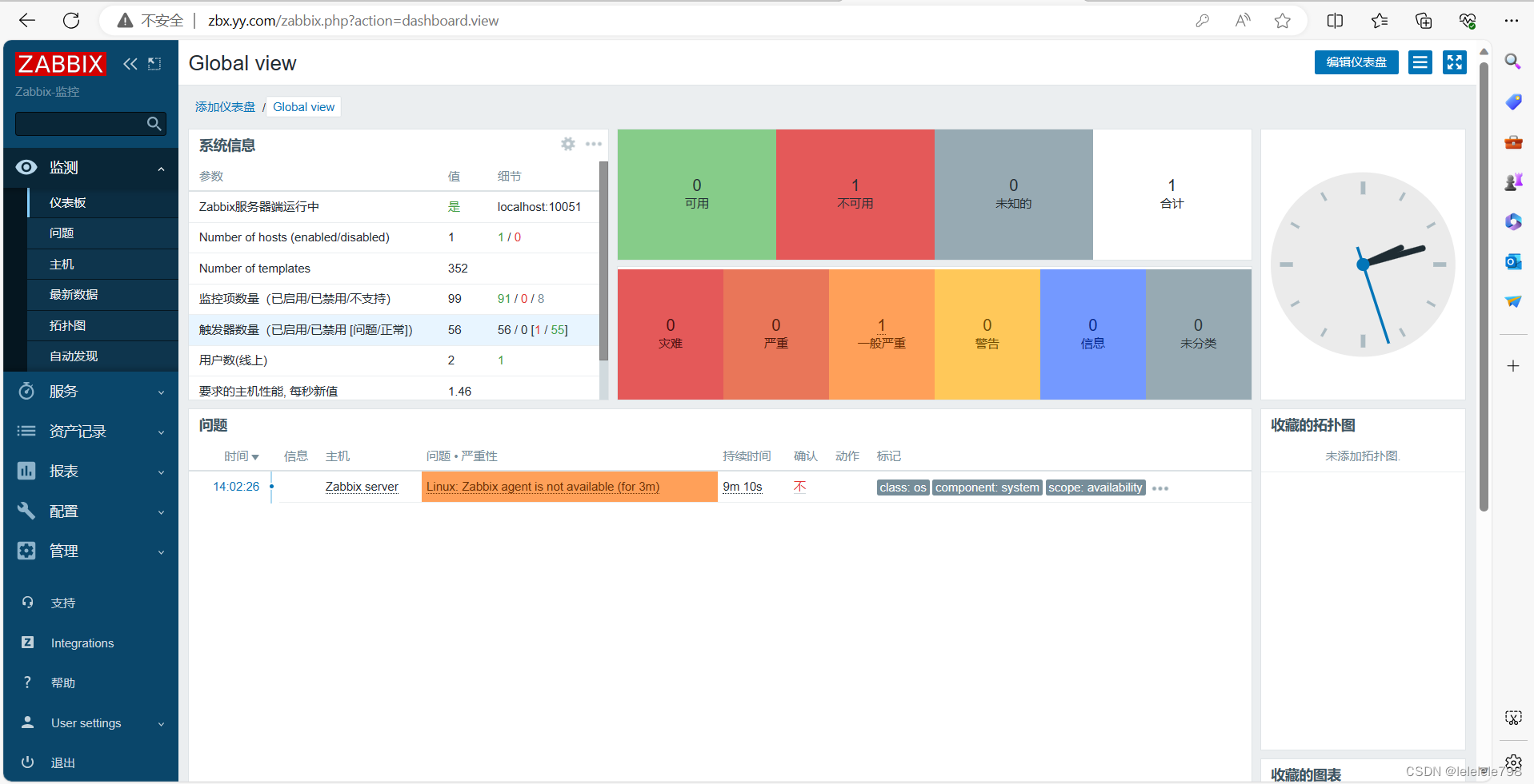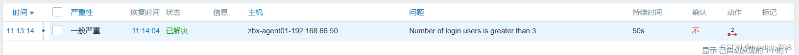 增加测试客户端的用户登录数超过触发器预设的值,查看【监测】-->【仪表板】,确认报警