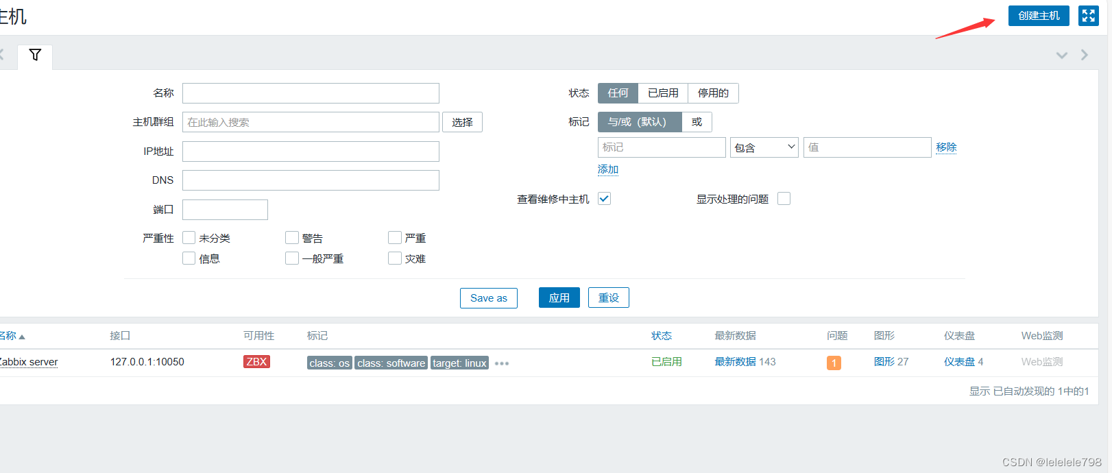 点击左边菜单栏【配置】中的【主机】,点击【创建主机】