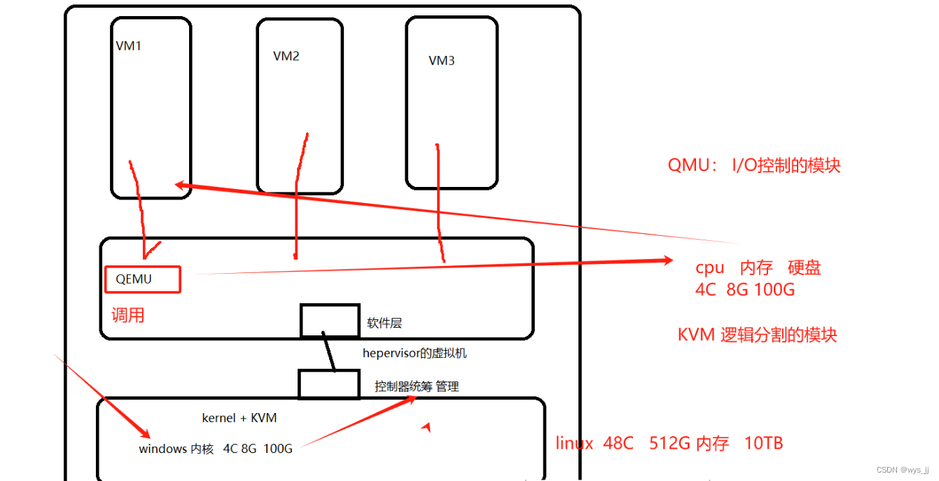 ②QEMU它并不是直接调用,而是用I/O方式调用,QEMU把资源调用来的过程借用ioctl,QEMU借助libvirt这个工具调用ioctl,再通过接口,给虚拟机应用程序。