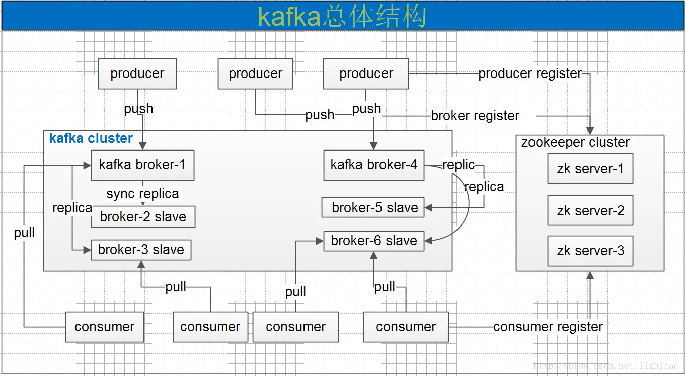 一个典型的kafka集群中包含若干producer,若干broker,若干consumer,以及一个Zookeeper集群。Kafka通过Zookeeper管理集群配置,选举leader,以及在consumer group发生变化时进行rebalance。producer使用push模式将消息发布到broker,consumer使用pull模式从broker订阅并消费消息。