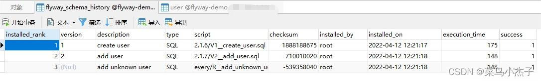 - 初次使用时,flyway会创建一个 flyway_schema_history 表,用于记录sql执行记录。